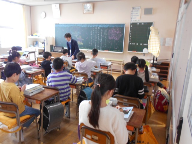 5年生最後の毛筆の授業でした。添削していただいたところに気をつけながら、「近づく春」の字を書き上げました。