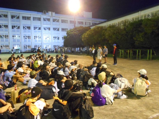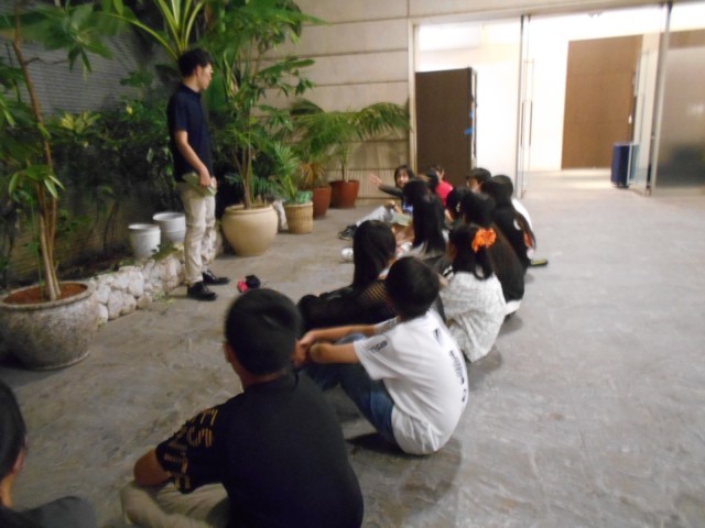 班長は、中庭で班長会を行い、今日の一日を振り返りました。他のメンバーは、各部屋で荷物を整理しながら、各自振り返りを行いました。