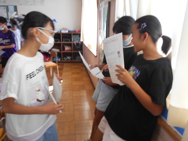 夏休みに何が楽しかったのか、”What did you enjoy?"と友達同士で聞き合い、サインをもらっていました。