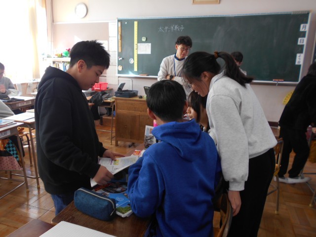 今回は、主人公の太一が、「どこで、どのように変化したのか」や、「何の影響を受けて心が変化したのか」について読んでいきました。太一と父や与吉じいさ、母との関係やそれらとの関わりによって生まれる太一の変容を考えたり、友達の意見との相違点や共通点を見付けたりする活動を通して、登場人物の相互関係や心情の変化を、叙述を基に捉えることができました。なお、この授業は、沼津教育振興会・国語部主催の「国語科一斉授業研修会」として、市内のたくさんの先生方に 授業を参観していただき、その後の話合いで、子供たちの表れ等をもとに、国語科の授業の在り方について考えていきました。