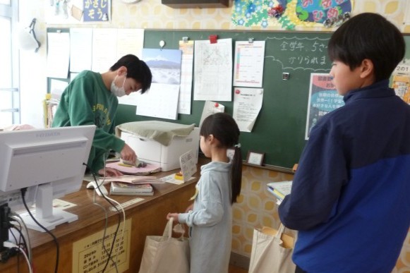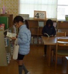 休み時間の図書館は、借りていた本を返したり、新しく読む本を借りたりする子供たちが来ていました。