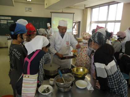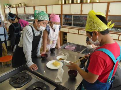 すばらしい包丁さばきを目の前で見せていただいた後,かぼちゃの煮物とだし巻き卵,みそ汁を作っていただきました。作っている途中から「おいしそう」という声が上がり,一口食べたらそのおいしさに感動する姿が見られました。とても貴重な体験をさせていただきました。