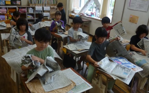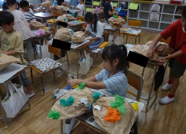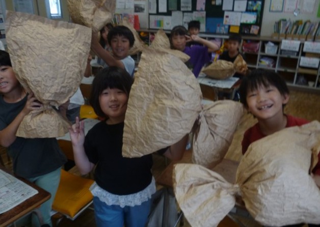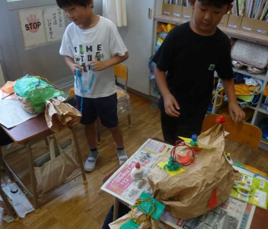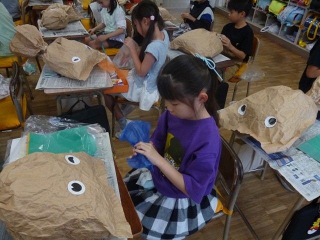 図工では、「くしゃくしゃ ぎゅっ」の学習を進めています。