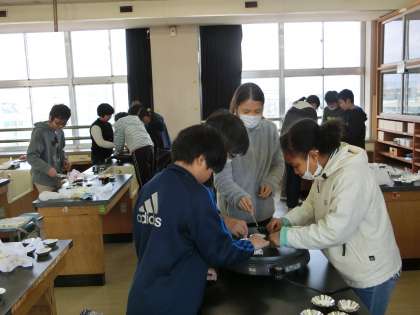 4年生が版画の作品を見合っていました。友だちの作品を見て、いいなと思ったところや工夫していると感じたところをメモして伝え合っていました。鑑賞する時間もとても大切な時間です。