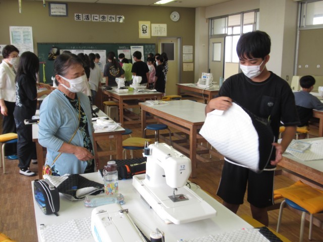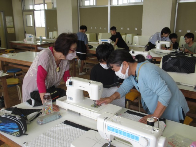 4名の授業支援ボランティア様にご支援いただき、ミシンを使った巾着袋づくりを行いました。