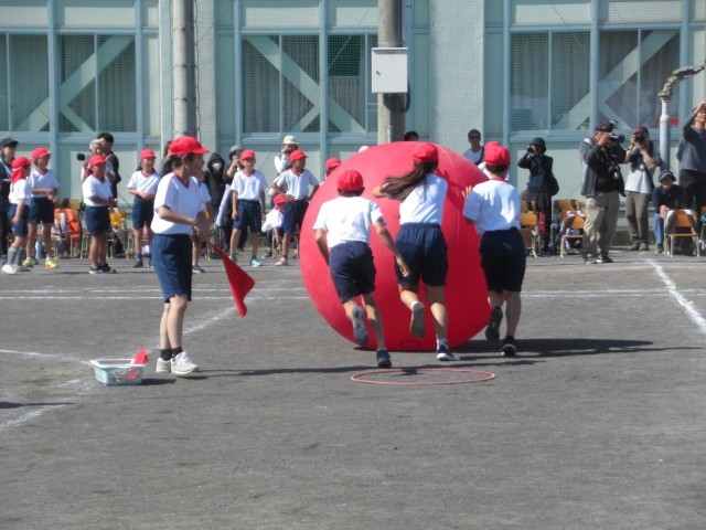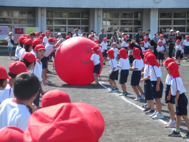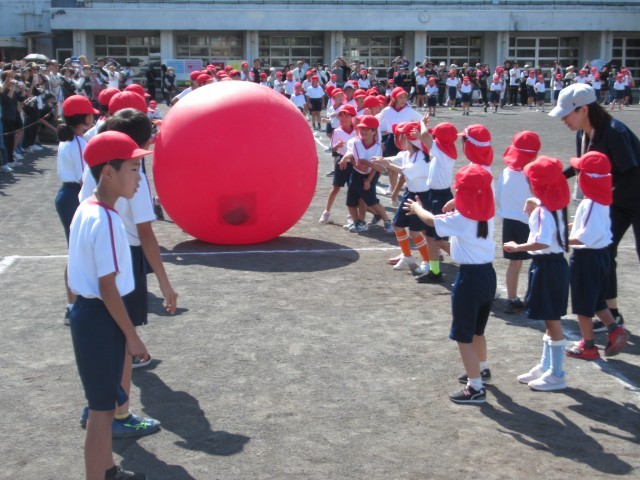 赤白全校「息合わせ みんなで 楽しく 大玉転がし」 紅組