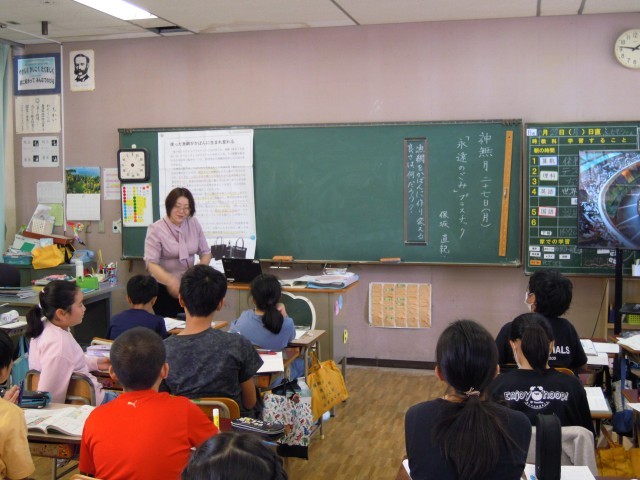 説明文を読み、漁網をかばんに作り変えることにはどのようなよさがあるのか、互いの意見を出し合っていました。