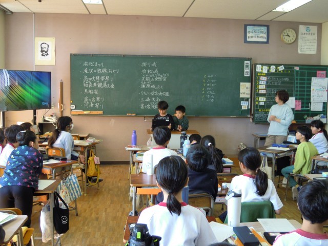 県内各地の文化財・伝統行事などについて、調べたことを発表していました。先生からは、発表を聞く時のメモの取り方のポイントについての話もありました。