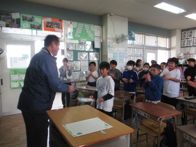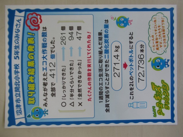 5年生が総合的な学習の時間で取り組んだ「アースキッズチャレンジ」によるエコ活動の成果発表をしました。