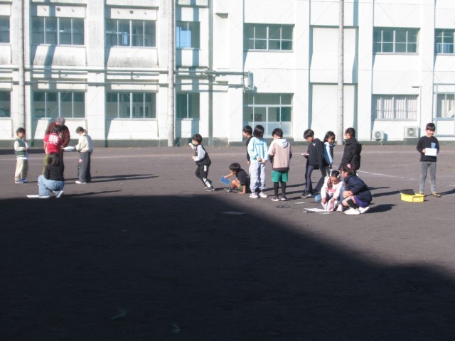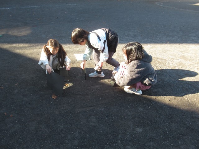 鏡で太陽光を反射させ、黑い紙に当てる実験をしています。そのとき温度は変化するのかが本時の課題です。
