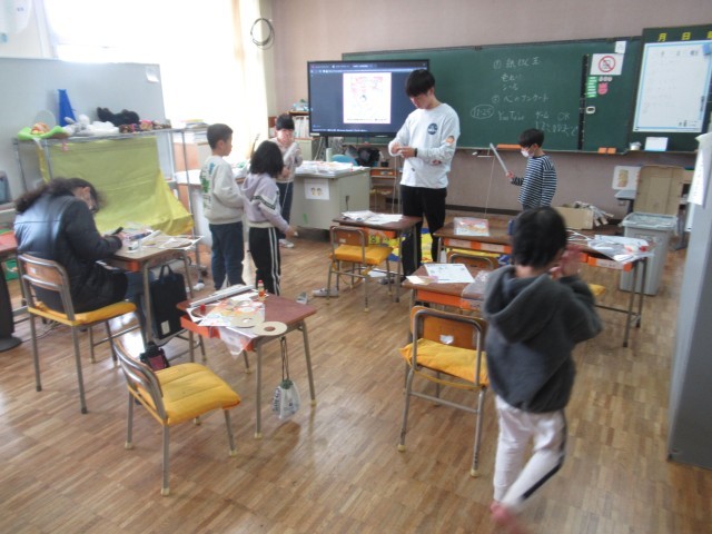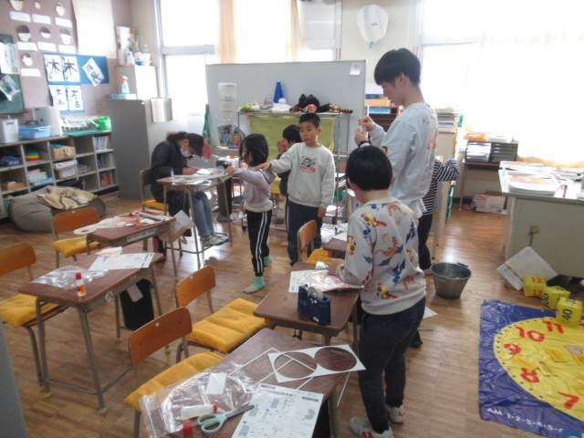 紙の教材を使い、みんなで遊べるものを工作しています。