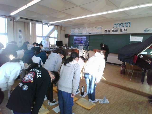 6年生は、全校の代表として音楽室の中継会場から終業式に参加しました。