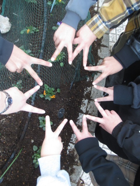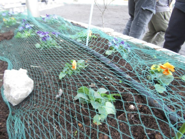 花壇にパンジーを植えましたが、たまにカラスがいたずらをしに来ます。そのことを知った6年生が、放課後遊びに来たついでに植え替えとネット張りを行ってくれました。本当にありがとうございました。