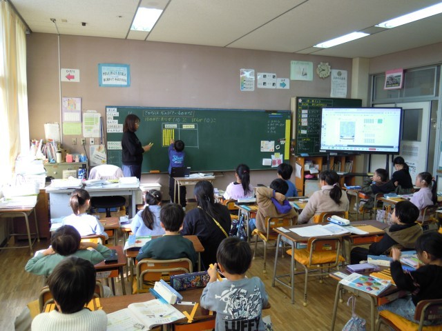 ブロックを使い、10のかたまりがいくつできるかを調べながら、魚が何匹いるのかを確かめています。