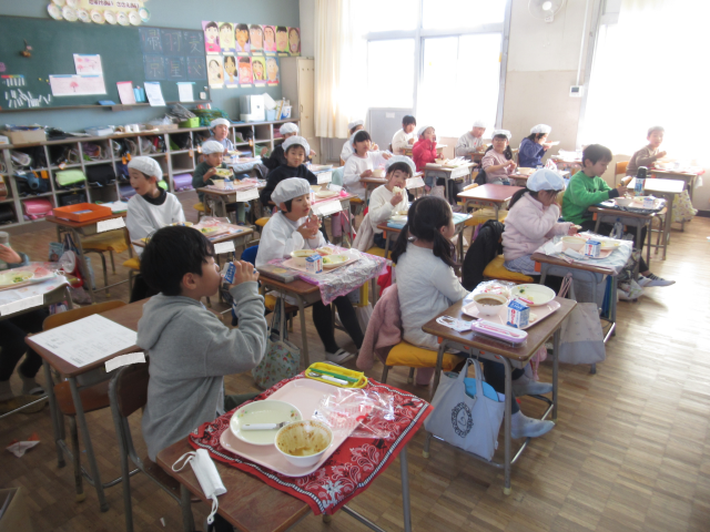今日は校長先生と一緒に給食を食べました。クラスに明るく楽しい雰囲気がいっぱいに広がっていました。