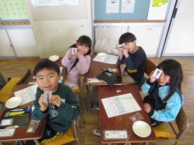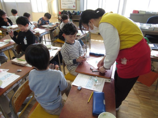 栄養教諭と栄養士の先生方をお招きし、箸の使い方講座が開かれました。最後はお米の粒までつかめるように上達していました。