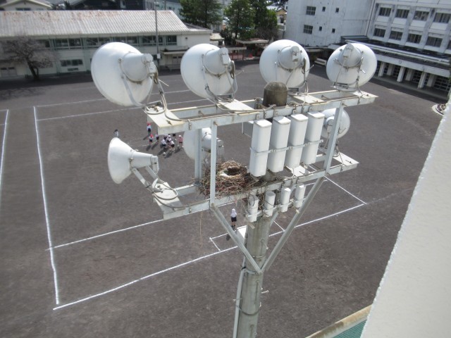 グラウンドの照明灯にカラスが巣を作っています。