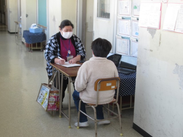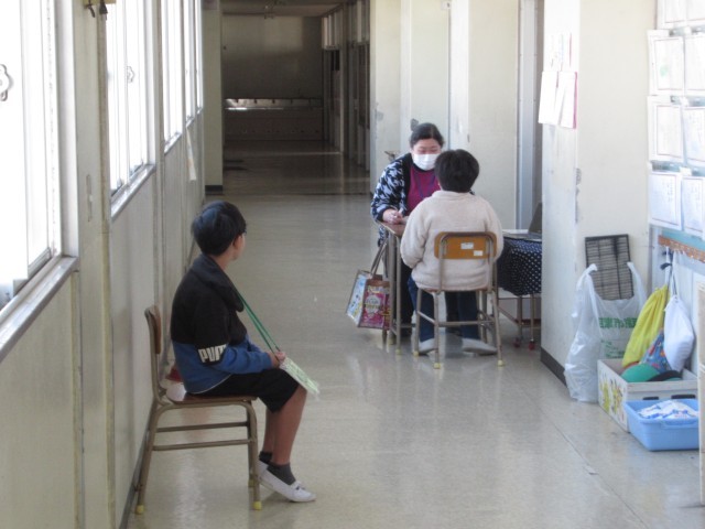 学期に1回、ALTの先生と児童一人一人が英会話の練習をしています。