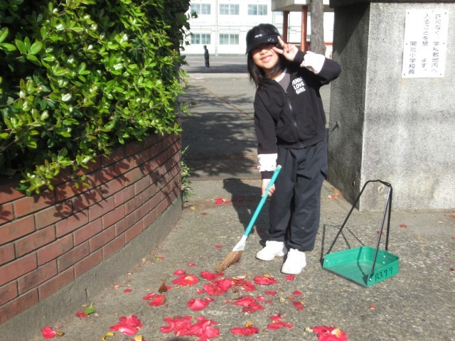 東門付近の椿の木から落ちた花びらをきれいに集めてくれました。
