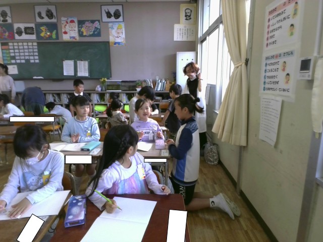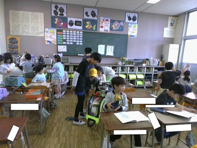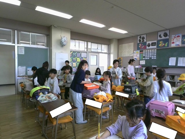 1年生の朝のしたくを、6年生がお手伝いにきてくれています。優しく声をかけながら一緒にやってくれるので、だんだん一人でもできるようになってきました。6年生に感謝です。