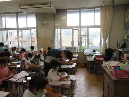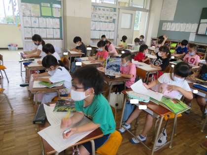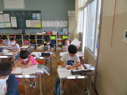 2年月組 国語の授業風景です。「調べよう まとめよう 生き物の 一生」です。前時までに、各々が決めた生き物の一生を、図鑑などで調べ、まとめています。生き物は、モンシロチョウ、ダンゴムシ、セミといろいろです。今日は、それを成長の順序がわかるように、「まず」「そして」などの順序がわかる言葉を使ったり、「始め」「中」「終わり」と文の構成を考えたりして、わかりやすい説明文にしていました。