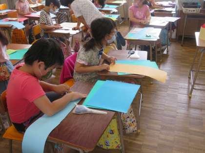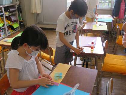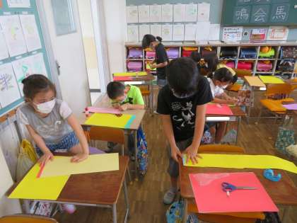 2年雪組 図工の授業風景です。「わっかで変身」です。色方眼の工作用紙を使い、わっかを作ります。そのわっかはベルトになる子もいれば、冠になる子もいます。参観した時には、輪ゴムを通すところを破れないよう、セロテープで補強していました。完成後は、装着し、大変身です。どんなものができるか楽しみです。