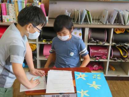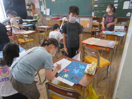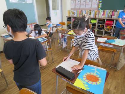 4年雪組 図工の授業風景です。「鑑賞」です。今日は自分たちが創った作品を批評し合っていました。今回子どもたちは、マーブリング、スタンピング、ローラー、スパッタリング、ビー玉ころころなど、いろいろな技法を学び、それを駆使しながら作品を仕上げました。鑑賞の時には、色合いや構成はもちろん、使った技法が効果的であったか、そんな視点で作品を見合っていました。