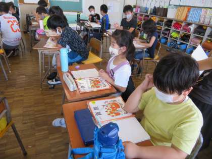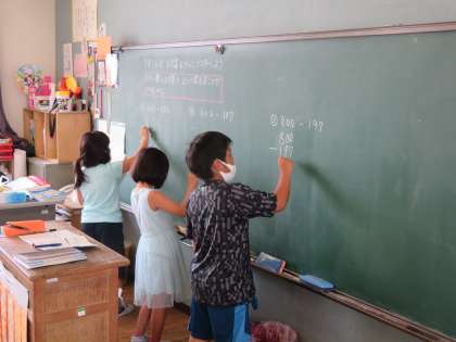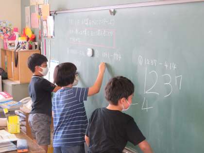 3年雪組 算数の授業風景です。今日は大きな数の引き算です。指名された児童が黒板でやることになりますが、多くの児童が意欲的に手を挙げていました。給食後の5時間目、そして気温も上がってきた中での授業でしたが、換気をしながらも空調設備を活用していることもあり、集中して授業に取り組めていました。