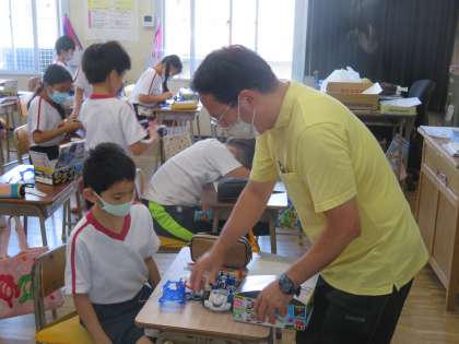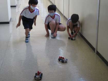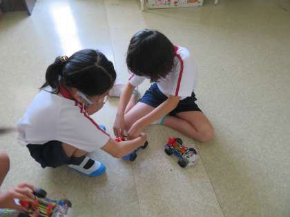 4年雪組 理科の授業風景です。乾電池1個のモーターの回る速さと比べて、直列・並列つなぎのモーターの回る速さがどう変わるかを予想し、実際に実験することで確かめていました。