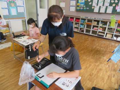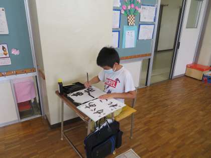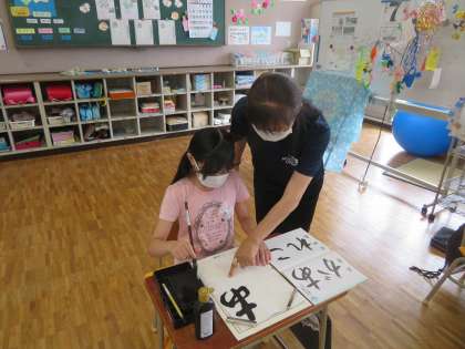 宙組 書写の授業風景です。毛筆です。「あこがれ」「思いやり」を書いていました。「あ」は筆の運びがとても難しそうでした。