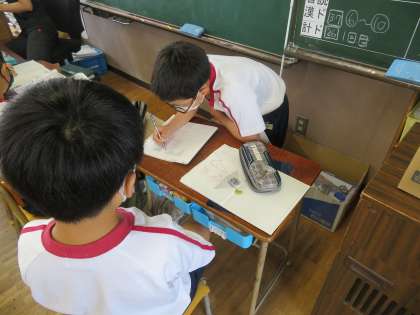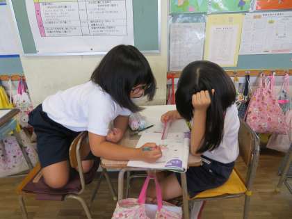 4年月組 算数の授業風景です。図形です。参観した時には、分度器を使って100°や270°を書いたり、三角定規を重ねたときにできる角の大きさを求めたりしていました。子どもにとっては、90°を越えたり、180°を越えたりすると、難易度がぐっと上がるようです。自力解決を図ろうとする子、互いに教え合い協力して解こうとする子、先生の助言を欲する子、いろいろです。しかし、どの子も一生懸命考えていました。