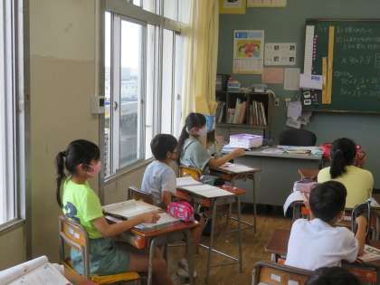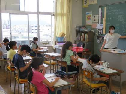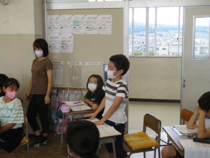 5年雪組 算数の授業風景です。整数×小数の筆算です。参観した時には、小数点の移動をどのようにしたら良いのかみんなで考えていました。