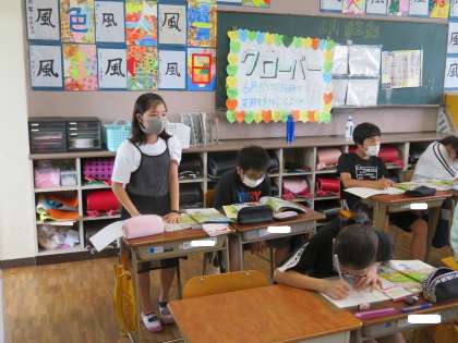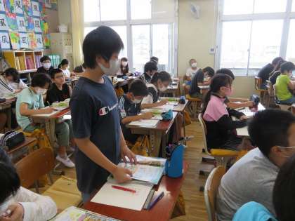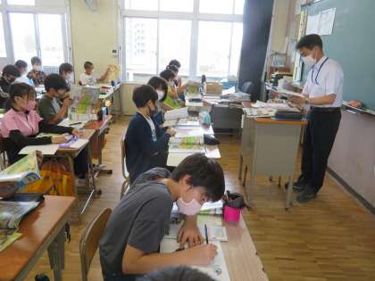 6年月組 社会の授業風景です。歴史です。今日は弥生時代の学習です。縄文時代から弥生時代になり、人々の生活がどのように変わっていったか、衣食住ごとに見ていきます。高床倉庫が出てきたときには、昨年社会科見学で訪れた登呂遺跡のことを想起していました。ネズミ返しのことに話しが及んだときには、「昔の人は頭がいいな〜」と一人の児童がぽつりと言っていたのが印象的でした。