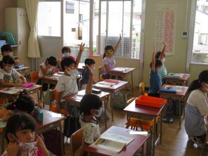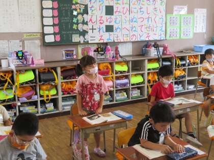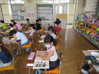 1年雪組 国語の授業風景です。「いきもののあし」です。本文には「アヒル」「ライオン」「ダチョウ」の足について、写真ととともに特長について説明が書かれています。今日まで学習してきました。今日、そして次時は、それを参考にしながら、「馬 ペンギン リス」の中から一つを選び、自分で説明文を書いていきます。参観した時には、写真をじっくり観察していました。