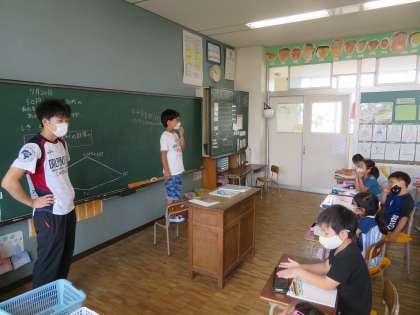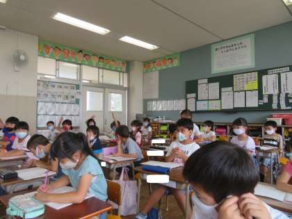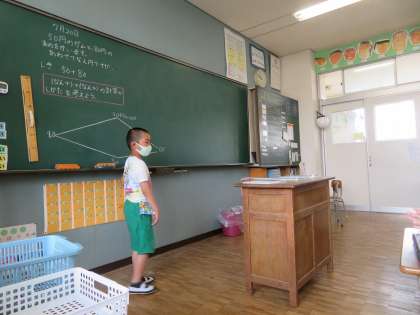 2年月組 算数の授業風景です。今日は、「50円のガムと80円のアメをそれぞれ1個ずつかったときに何円になるか」という問題を考えました。参観した時には、自分の考えを黒板で2名の児童が発表していました。発表を聞いていた児童の中からは「なるほど」という声が上がりました。すとんと納得がいったようです。
