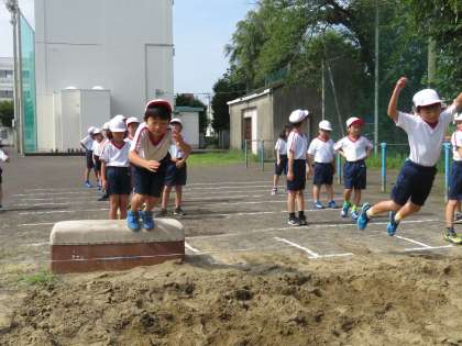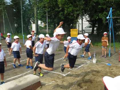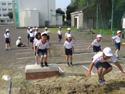 3年雪組 体育の授業風景です。立ち幅跳びです。 授業は1時間目でしたが、湿度も高く、蒸し暑くなりました。合間合間に水分補給の時間を設け、熱中症にも注意をしながら授業を行いました。