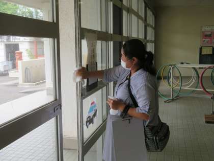 朝の様子です。登校前には、先生方がグランドにラインを引き、その後の子どもたちの登校を児童玄関や教室で待ち受けます。また、子どもたちが登校し終わった後の1時間目には、養護教諭が生徒玄関を始めとする校内いろいろな箇所の消毒作業に当たります。子どもたちの安全を第一に取り組んでいます。7月も下旬に入り、今朝は一段と蝉の声が大きく感じられました。、