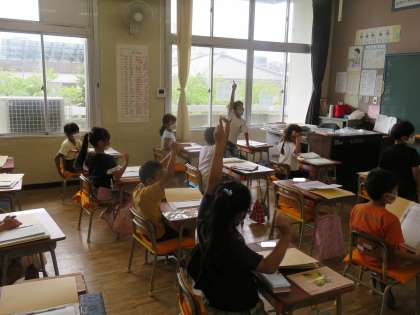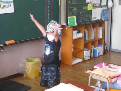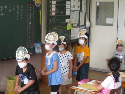1年月組 国語の授業風景です。今日は、「大きなかぶ」の劇です。参観した時は、登場人物のおじいさん、おばあさん、まご、いぬ、ねこ、ねずみに、代表児童6人がなりきり、お面を付けて劇をみんなの歌に合わせて演じていました。とても上手でかわいらしかったです。他の子もやりたくてしょうがない様子でした。