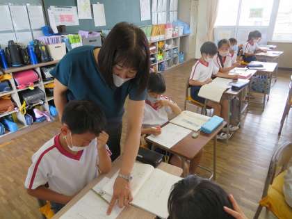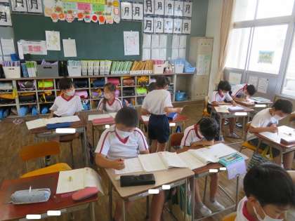 3年月組 国語の授業風景です。「考えをまとめよう、広げよう」です。個々にテーマを決め、ウェビングを使って、考え方の広げ方をつかみ、思いついたことを書き出していました。テーマは、「犬」「カブトムシ」「カマキリ」「みかん」など、様々でした。