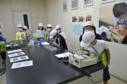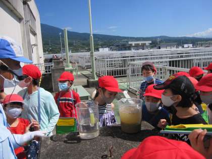 狩野川西部浄化センターでは、下水処理の仕組みを学びました。処理をする前の水と処理した後の水を比べて、その違いに驚いたり、小さな微生物の働きによって水がきれいにされていることに感心したりしていました。