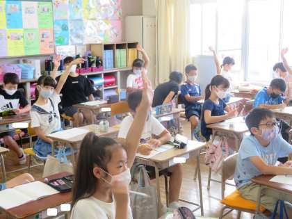 4年月組 算数の授業風景です。概数の学習です。参観した時には、四捨五入して百の位までの概数にした時、800になる整数について考えていました。自力解決をめざす子、友達と相談する子、いろいろでした。