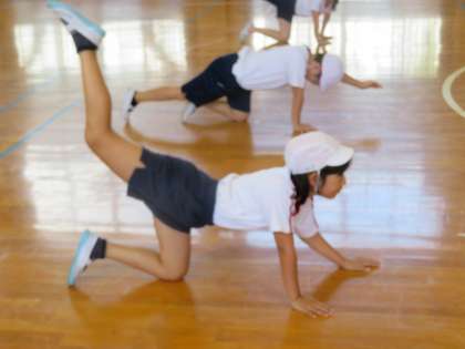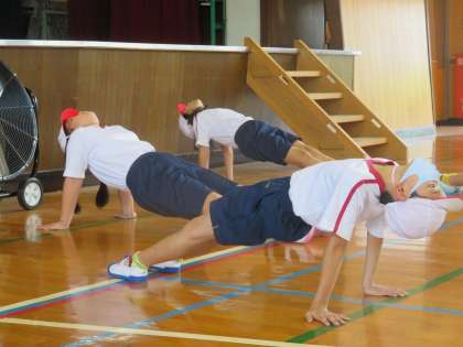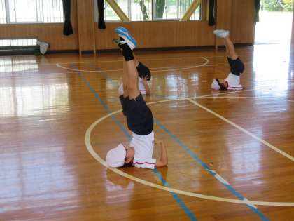4年雪組 体育の授業風景です。運動会に向け、「表現」で行う1人技の練習をしていました。ブリッジや肩倒立などを練習していましたが、指先まで注意しながら行っていました。