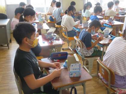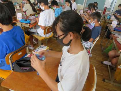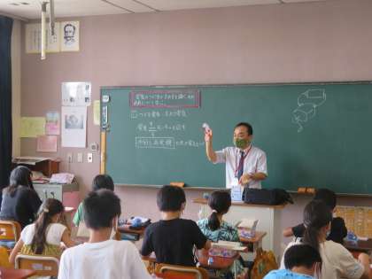 6年雪組 理科の授業風景です。「電気」です。今は、電気の作り方やため方を調べ、利用について学習しています。参観した時には、教具の手回し発電機を使って電気を作り、豆電球を点灯させ確認していました。