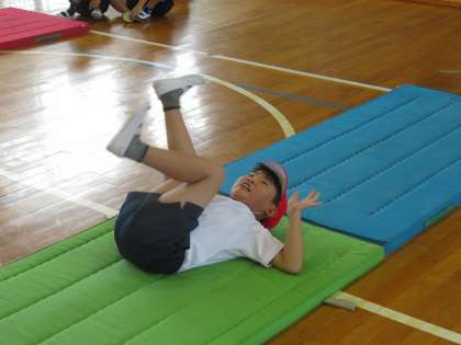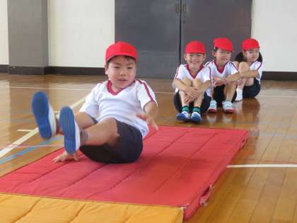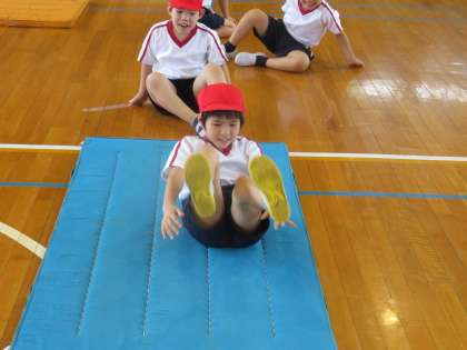 2年月組 体育の授業風景です。マット運動です。参観した時には、前転の練習をしていました。担任が見本を見せると「アルマジロみたい」と子どもたちの声。楽しそうに練習が始まりました。