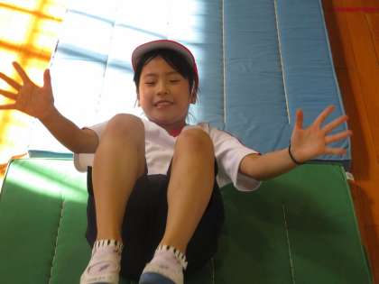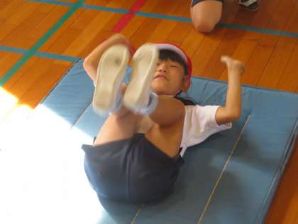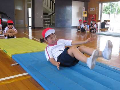 2年月組 体育の授業風景です。マット運動です。1でマットに手をつき、2でおへそを見て、3で前転です。タイミングを取りながら繰り返し練習をしていました。