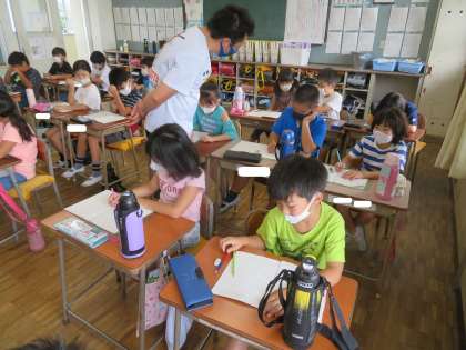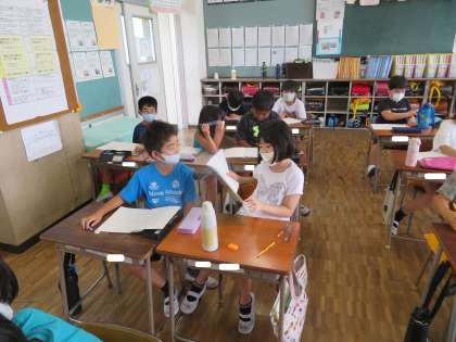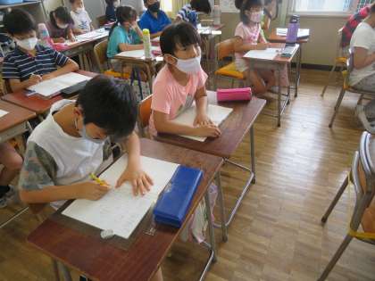 3年雪組 社会の授業風景です。「いろいろな役目のお店」です。教室を覗くと、すでに黒板に、スーパーマーケット以外のお店が書かれていました。お菓子屋や本屋、薬局などなど。参観した時には、それぞれのお店の役割について考えているところでした。良いところ、なかったらどうなってしまうのか、そんな視点で自分の考えを書いていました。専門店の理解が進んだ1時間となったようです。