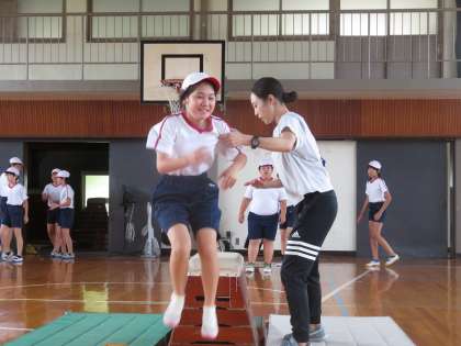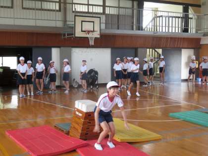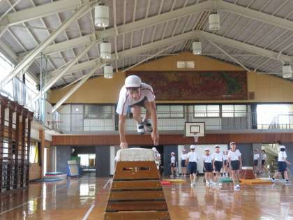 6年雪組 体育の授業風景です。跳び箱です。今日は開脚跳び、閉脚跳びの練習をしました。やはり閉脚跳びは難しいようで、どの子も苦労していました。