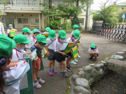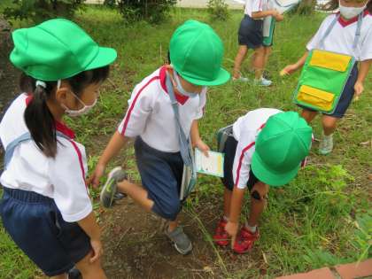 1年雪組 生活科の授業風景です。今日は、学校敷地内で生き物を探しました。アリ、チョウ、ダンゴムシ、毛虫などなど。見つける度に大喜びな1年生でした。