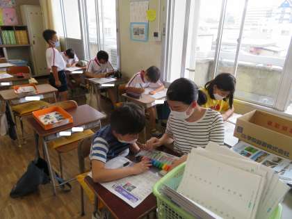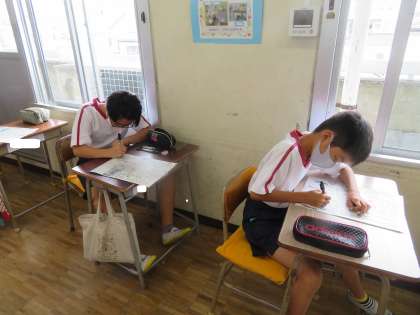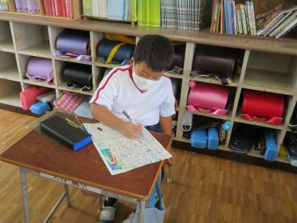 4年月組 国語の授業風景です。先日の社会科見学を受けて、今日は環境新聞を作っていました。見学先で教えていただいたことを如何に分かりやすく伝えるか、苦心していました。イラストを描いたり、4コマ漫画で説明したり、写真を載せたり、見出しの言葉でひき付けたり、色を上手に使ったりと、文章以外にもいろいろな工夫を施していました。