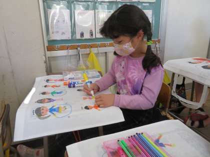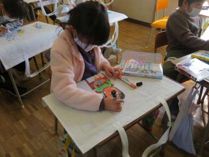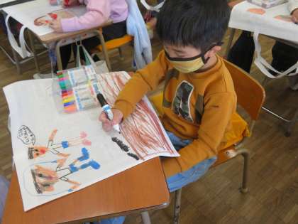 2年生 図工の授業風景です。作品バックに思い出の絵をカラーペンで描いています。昼休みみんなでグランドで遊んだ様子、漢字を一生懸命覚えたことなど、楽しかったこと、頑張ったこと、うれしかったことが、たくさん描かれていました。漢字を一生懸命覚えた子は、今度漢検にチャレンジするんだとお話をしてくれました。写真は雪組の様子です。